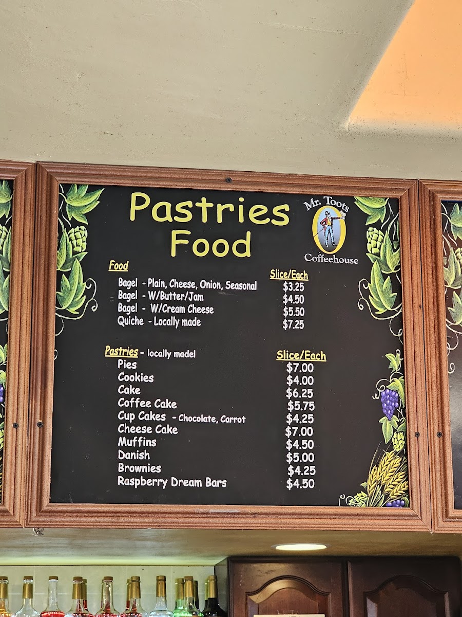 The menu at Mr Toots Coffeehouse offers a variety of coffee beverages, breakfast items, pastries, and light snacks suitable for different times of the day, including morning and afternoon coffee breaks or light meals. It is organized into clear sections to facilitate easy selection for quick orders or casual dining.